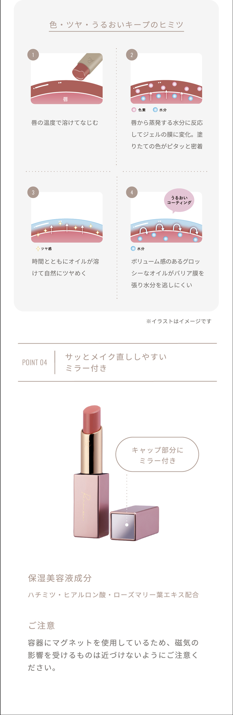 ●傷・はれもの・湿しんなど、唇に異常があるときはご使用をお控えください。