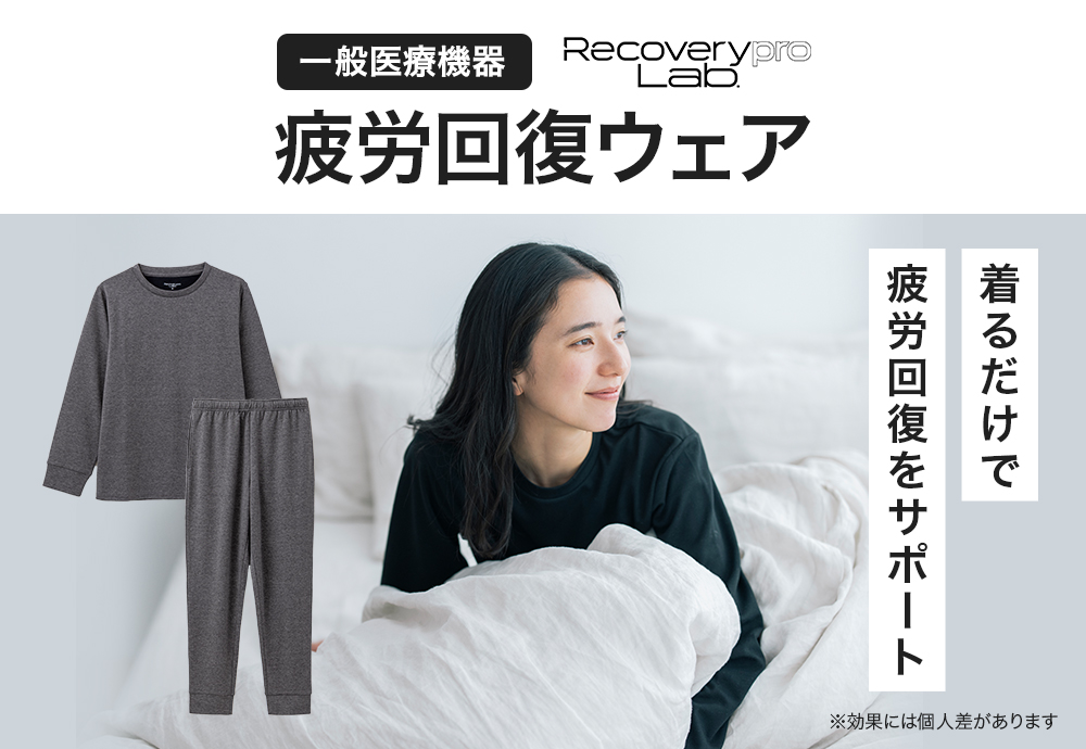 「着るだけで疲労回復をサポート」※ ルームウェアの医療機器Recoverypro Lab.(リカバリープロラボ)は 一般医療機器に届出された疲労回復ウェアです。 ※効果には個人差があります。